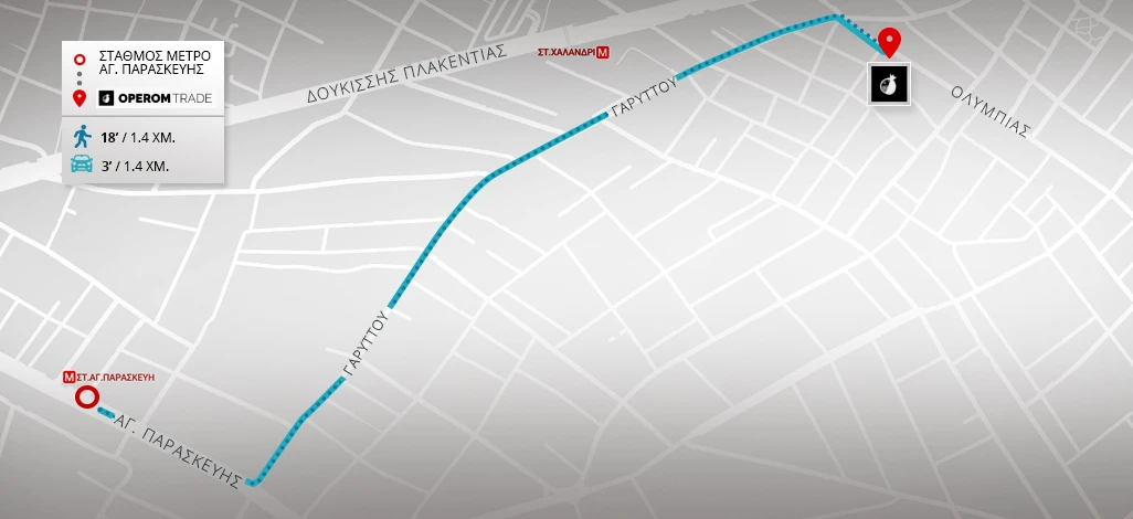 Από τον σταθμό Αγίας Παρασκευής οδηγείτε την οδό Αγίας Παρασκευής με κατεύθυνση προς τη λεωφόρο Μεσογείων. Στρίβετε αριστερά στην κάθετη οδό Γαρυττού και μετά από λίγα μέτρα δεξιά στην οδό Ολυμπίας όπου βρίσκεται το 1-3.gr (Ολυμπίας 47).